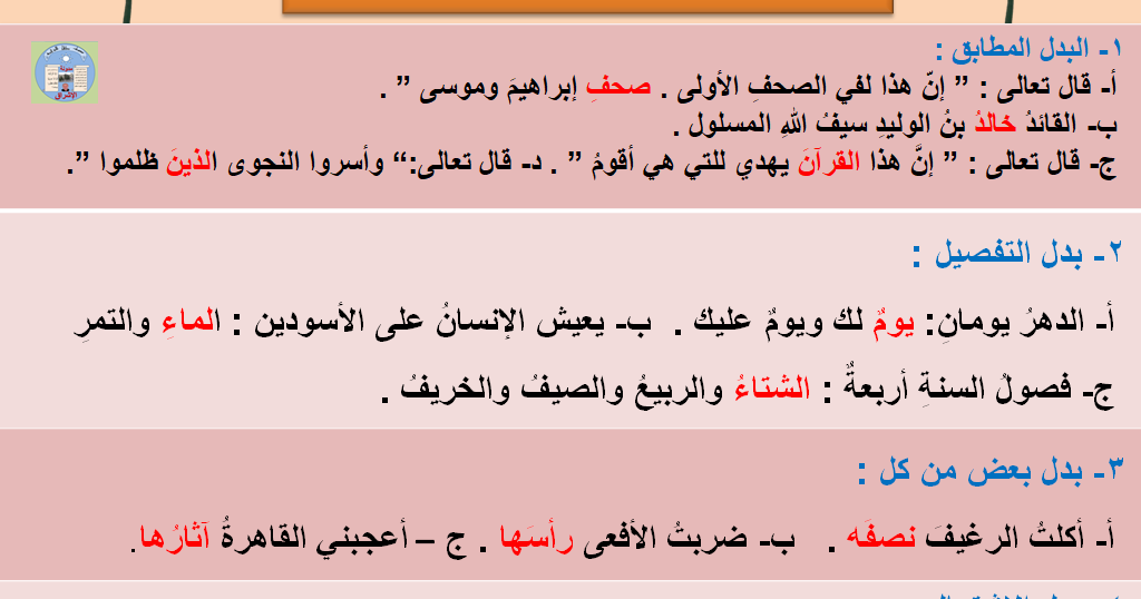ازدهرت الصناعة في عهد الرئيس مبارك فمبارك بدل من الرئيس فالذي قصد. أريج بدل اشتمال مجرور وعلامة جره الكسرة الظاهرة على أخره. نفعني المعلم علم ه. البدل غير المطابق أو بدل بعض من كل هو أن يكون البدل جزء من المبدل منه مثل قرأت الكتاب نصفه.