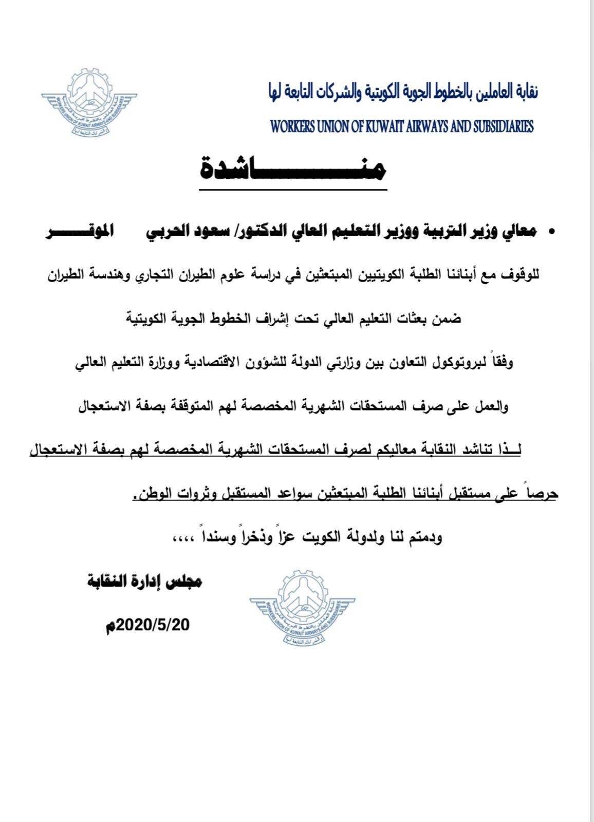 نقابة الكويتية Pa Twitter مناشدة وزير التربية ووزير التعليم العالي الدكتور سعود الحربي صرف المستحقات الشهرية لطلبة علوم الطيران التجاري وهندسة الطيران الخطوط الكويتية وزارة التعليم العالي Https T Co Mpfyitojpg